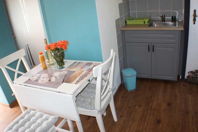 ein Essbereich mit Tisch und 4 Stühlen (Hochstuhl auf Wunsch)