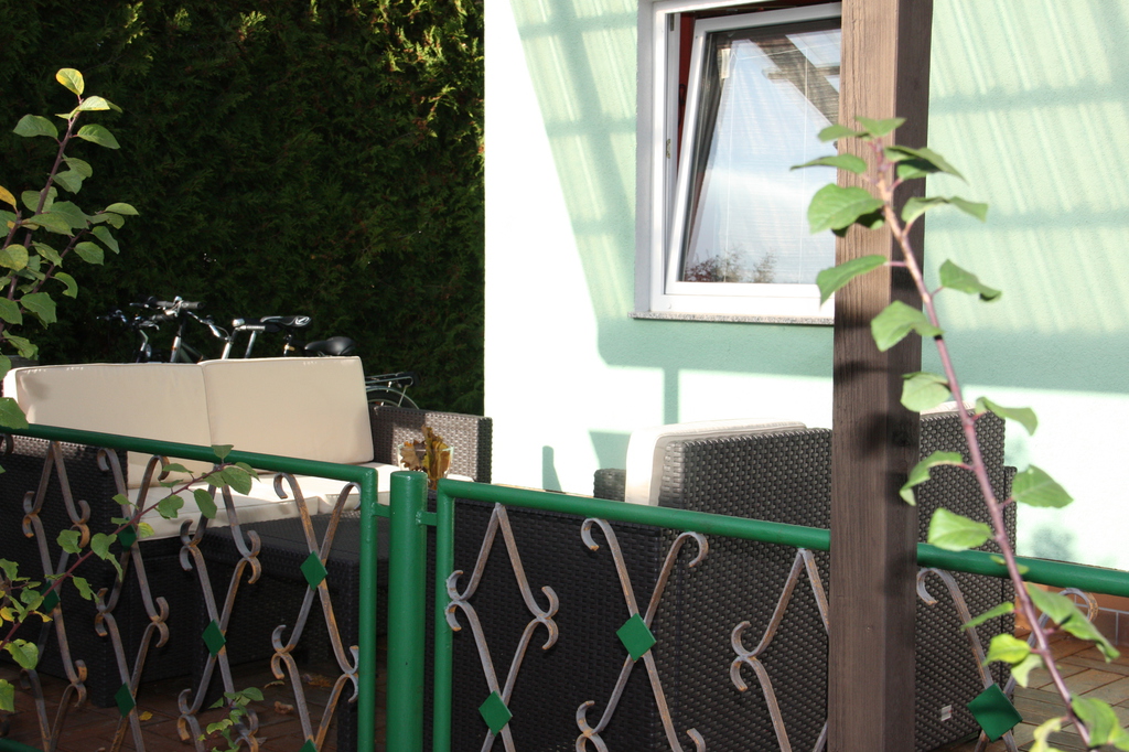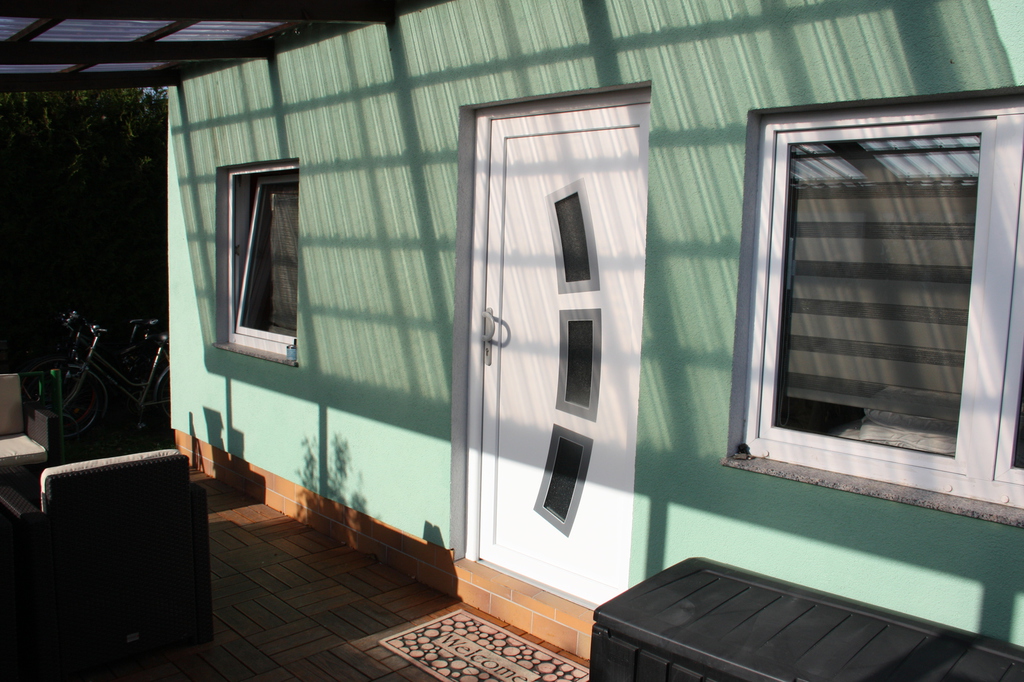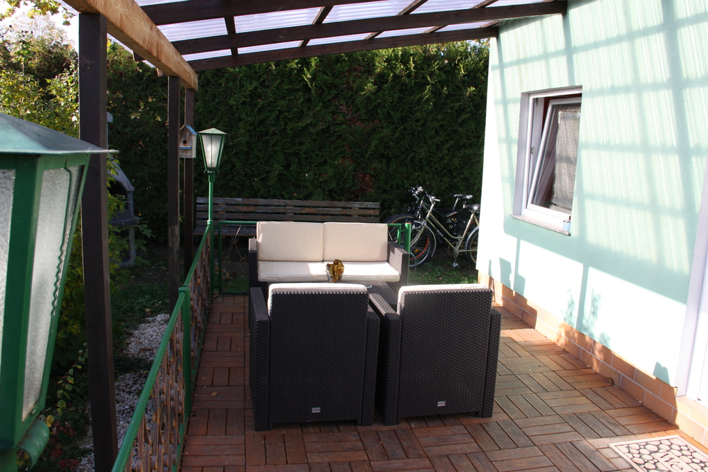 Auf der überdachten Terrasse genießen Sie Sonne oder Schatten - ideal zum Frühstücken oder für gemütliche Grillabende. Ein eigener Grill ist vorhanden. Hinter dem Haus lädt zusätzlich eine kleine Sitzbank zum Verweilen ein.