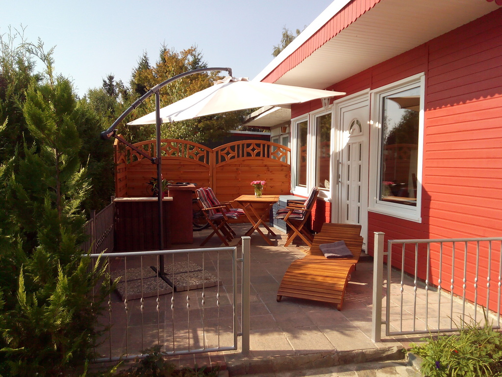 Der Bungalow befindet sich in ruhiger, aber zentraler Lage - nur wenige Meter vom Spielplatz und einem kleinen Automatenladen entfernt.