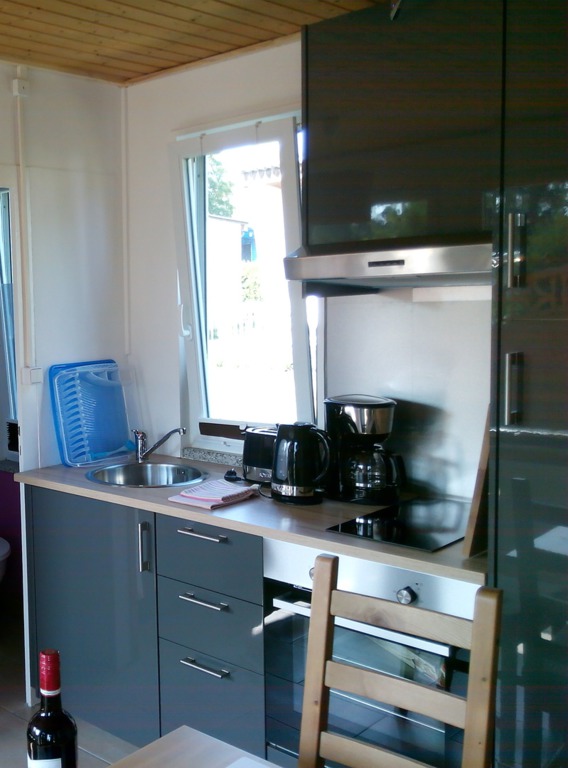 voll ausgestattete Küchenzeile mit Ceranfeld, Backofen, Abzugshaube, Kaffeemaschine, Toaster, Wasserkocher, Töpfen, Pfannen, Geschirr und Besteck