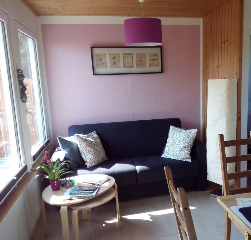 kombinierter Wohn- und Schlafbereich mit Dopppelbett. (160×200 cm) und Schlafcouch (140×200 cm)